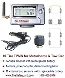 Are you looking for the best review for 10 Tire RV Cap Sensor Tire Pressure Monitoring System (TPMS)? Read customer review, features, specifications, description, check prices update and more satisfying for 10 Tire RV Cap Sensor Tire Pressure Monitoring System (TPMS) product reviews! This 10 tire tire pressure monitoring system for RV towing a car has a dash-mounting monitor that shows tire pressure and temperature at all times. It alerts users to abnormal tire position as well as low and high tire pressure levels with alarm icons, red light, and an audible warning. The high pressure, high temperature, and per axle low pressure warning levels are user-adjustable. This item supports PSI/Bar and Fahrenheit or Celsius measurement units (user selectable). The light-weighted external cap sensor (.45oz) installing on the tire valve stem is waterproof and its battery is user-replaceable. The monitor has a rechargeable battery and is portable. The sensor signals have long range so therefore mostly it is not necessary for motorhomes and big rig tractors to install a signal booster. HCI developed the TPMS systems in USA by in-house engineers and make all products in its own factories.